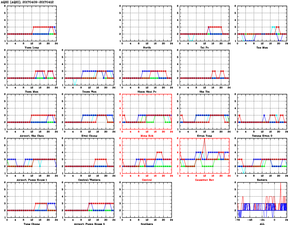 | Air Quality Data Time Series for AQHI (2017/04/12) | ( Line colors: Day -3 Day -2 Day -1 Current day ) | 2D Map Current AQHI |