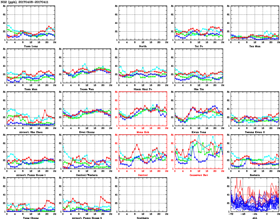 | Air Quality Data Time Series for NO2 (2017/04/11) | ( Line colors: Day -3 Day -2 Day -1 Current day ) | 2D Map Current AQHI |