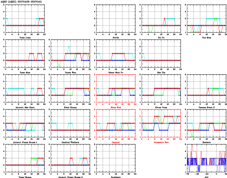 | Air Quality Data Time Series for AQHI (2017/04/11) | ( Line colors: Day -3 Day -2 Day -1 Current day ) | 2D Map Current AQHI |