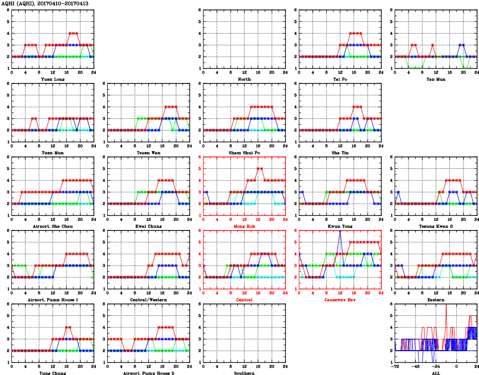 | Air Quality Data Time Series for AQHI (2017/04/13) | ( Line colors: Day -3 Day -2 Day -1 Current day ) | 2D Map Current AQHI |