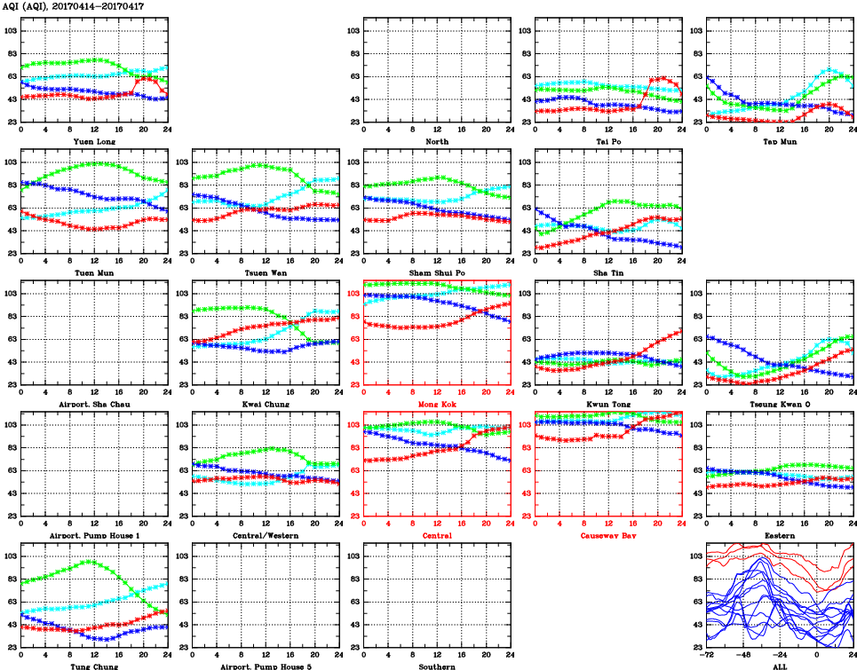 | Air Quality Data Time Series for AQI (2017/04/17) | ( Line colors: Day -3 Day -2 Day -1 Current day ) | 2D Map Current AQHI |