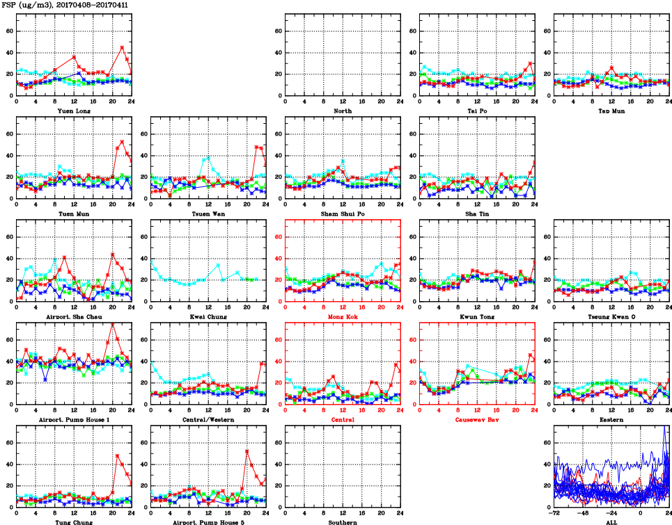 | Air Quality Data Time Series for FSP (2017/04/11) | ( Line colors: Day -3 Day -2 Day -1 Current day ) | 2D Map Current AQHI |