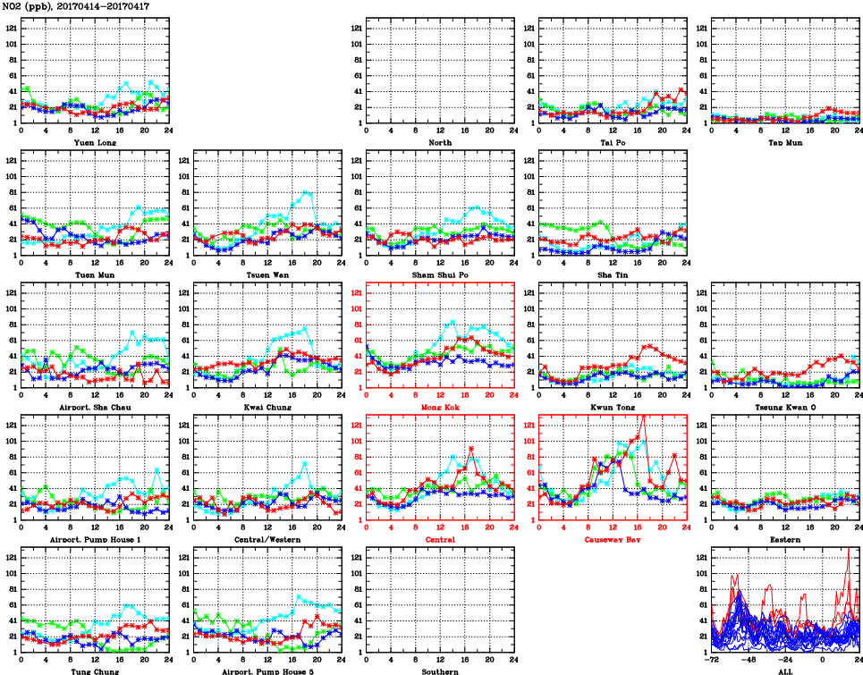 | Air Quality Data Time Series for NO2 (2017/04/17) | ( Line colors: Day -3 Day -2 Day -1 Current day ) | 2D Map Current AQHI |