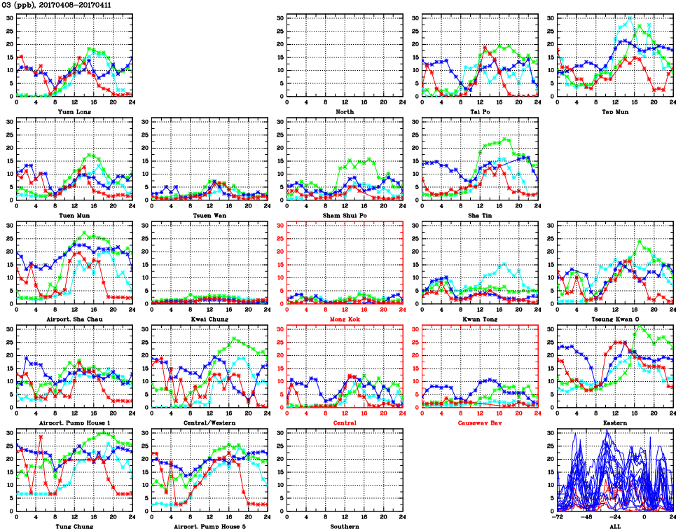 | Air Quality Data Time Series for O3 (2017/04/11) | ( Line colors: Day -3 Day -2 Day -1 Current day ) | 2D Map Current AQHI |