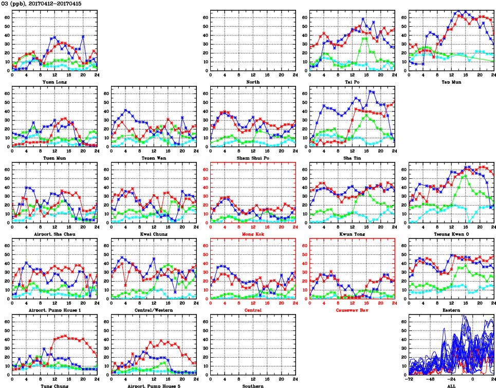 | Air Quality Data Time Series for O3 (2017/04/15) | ( Line colors: Day -3 Day -2 Day -1 Current day ) | 2D Map Current AQHI |