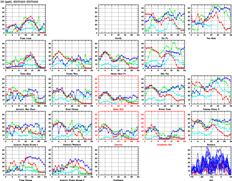 | Air Quality Data Time Series for O3 (2017/04/16) | ( Line colors: Day -3 Day -2 Day -1 Current day ) | 2D Map Current AQHI |