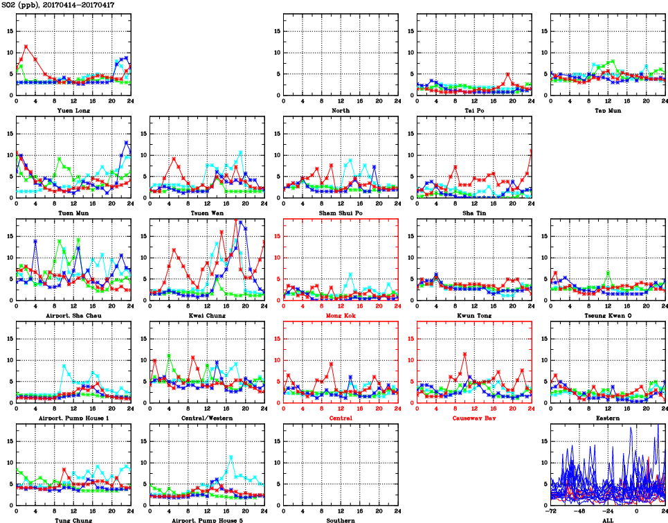 | Air Quality Data Time Series for SO2 (2017/04/17) | ( Line colors: Day -3 Day -2 Day -1 Current day ) | 2D Map Current AQHI |