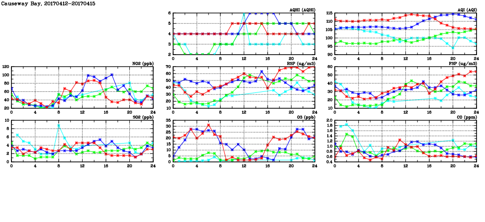 | Air Quality Data Time Series in Causeway Bay (2017/04/15) | ( Line colors: Day -3 Day -2 Day -1 Current day ) | 2D Map Current AQHI |