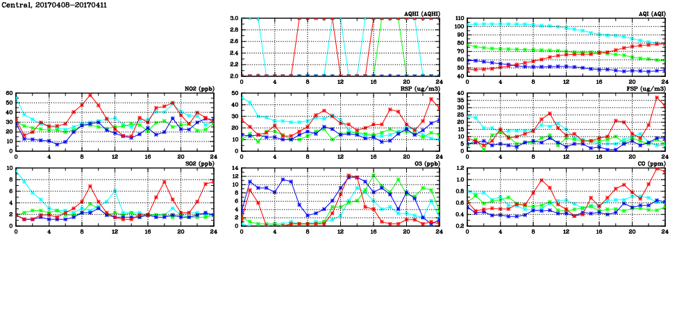 | Air Quality Data Time Series in Central (2017/04/11) | ( Line colors: Day -3 Day -2 Day -1 Current day ) | 2D Map Current AQHI |