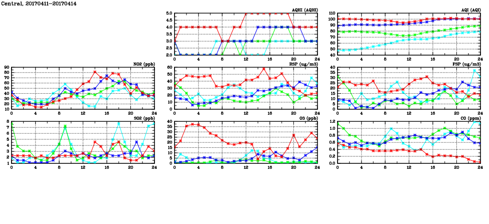 | Air Quality Data Time Series in Central (2017/04/14) | ( Line colors: Day -3 Day -2 Day -1 Current day ) | 2D Map Current AQHI |