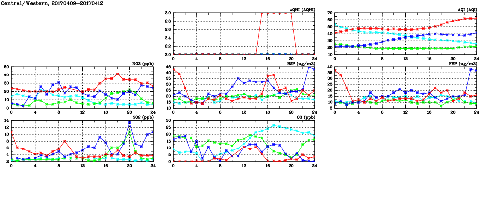 | Air Quality Data Time Series in Central/Western (2017/04/12) | ( Line colors: Day -3 Day -2 Day -1 Current day ) | 2D Map Current AQHI |