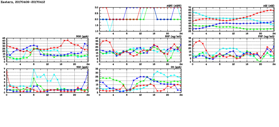 | Air Quality Data Time Series in Eastern (2017/04/12) | ( Line colors: Day -3 Day -2 Day -1 Current day ) | 2D Map Current AQHI |