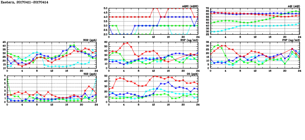 | Air Quality Data Time Series in Eastern (2017/04/14) | ( Line colors: Day -3 Day -2 Day -1 Current day ) | 2D Map Current AQHI |