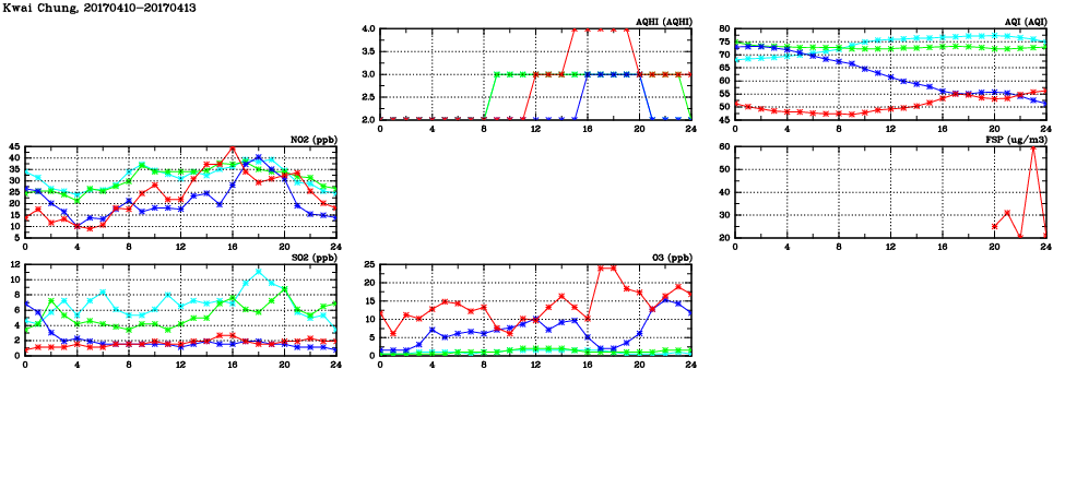 | Air Quality Data Time Series in Kwai Chung (2017/04/13) | ( Line colors: Day -3 Day -2 Day -1 Current day ) | 2D Map Current AQHI |