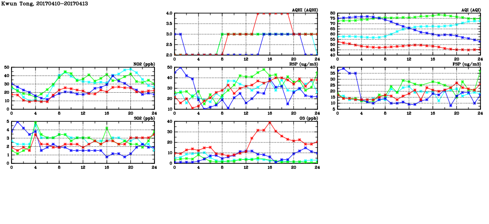 | Air Quality Data Time Series in Kwun Tong (2017/04/13) | ( Line colors: Day -3 Day -2 Day -1 Current day ) | 2D Map Current AQHI |