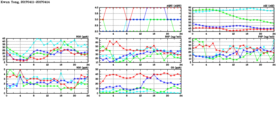 | Air Quality Data Time Series in Kwun Tong (2017/04/14) | ( Line colors: Day -3 Day -2 Day -1 Current day ) | 2D Map Current AQHI |