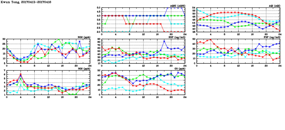 | Air Quality Data Time Series in Kwun Tong (2017/04/16) | ( Line colors: Day -3 Day -2 Day -1 Current day ) | 2D Map Current AQHI |