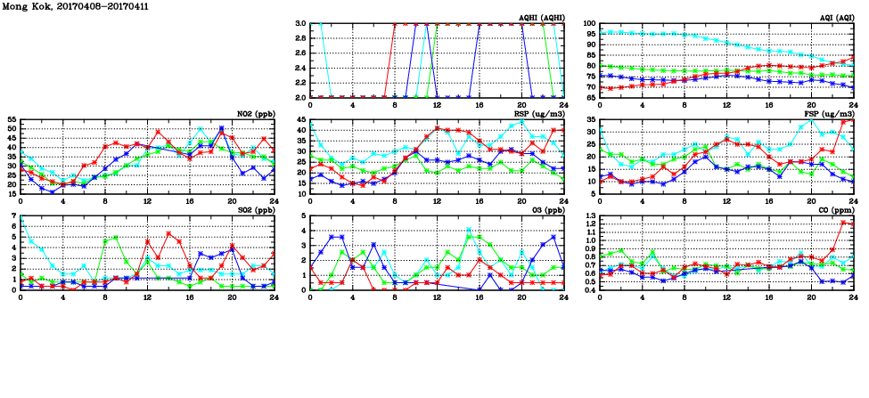 | Air Quality Data Time Series in Mong Kok (2017/04/11) | ( Line colors: Day -3 Day -2 Day -1 Current day ) | 2D Map Current AQHI |