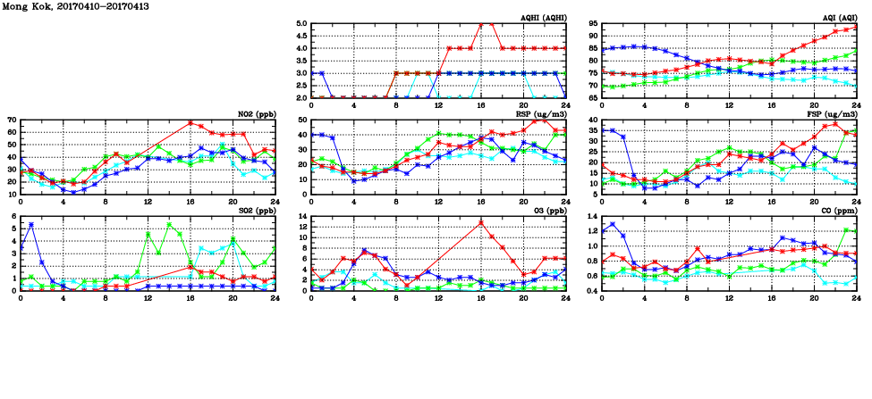| Air Quality Data Time Series in Mong Kok (2017/04/13) | ( Line colors: Day -3 Day -2 Day -1 Current day ) | 2D Map Current AQHI |