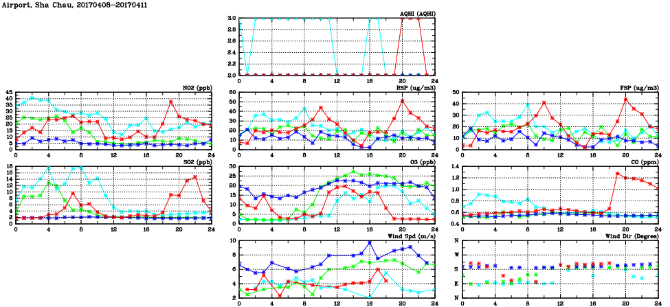 | Air Quality Data Time Series in Airport, Sha Chau (2017/04/11) | ( Line colors: Day -3 Day -2 Day -1 Current day ) | 2D Map Current AQHI |