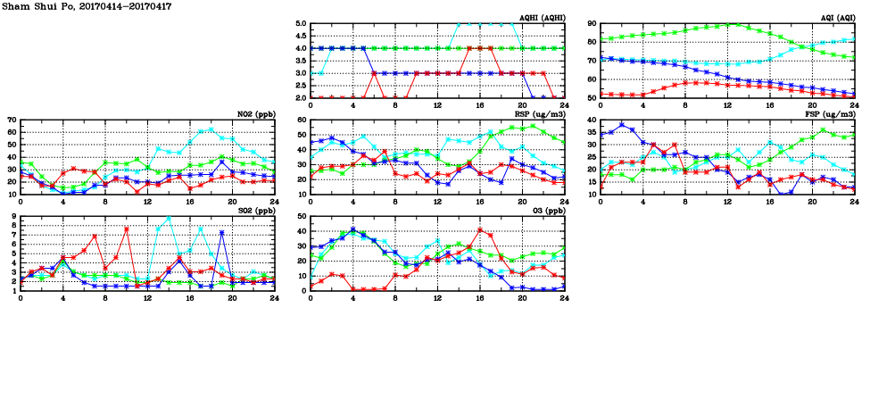 | Air Quality Data Time Series in Sham Shui Po (2017/04/17) | ( Line colors: Day -3 Day -2 Day -1 Current day ) | 2D Map Current AQHI |