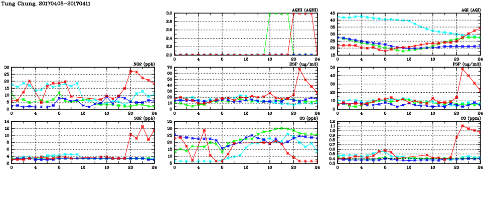 | Air Quality Data Time Series in Tung Chung (2017/04/11) | ( Line colors: Day -3 Day -2 Day -1 Current day ) | 2D Map Current AQHI |