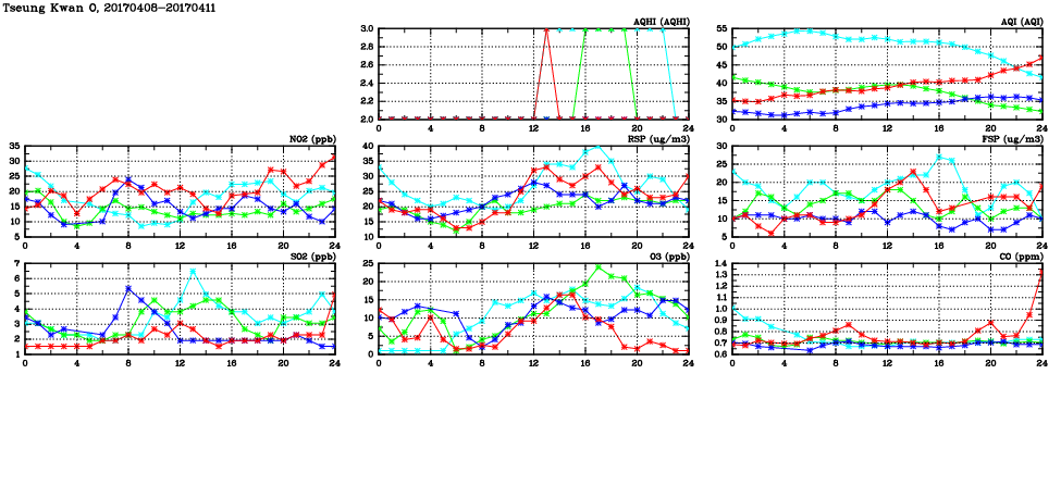 | Air Quality Data Time Series in Tseung Kwan O (2017/04/11) | ( Line colors: Day -3 Day -2 Day -1 Current day ) | 2D Map Current AQHI |