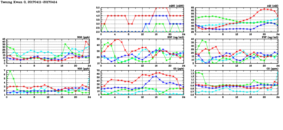 | Air Quality Data Time Series in Tseung Kwan O (2017/04/14) | ( Line colors: Day -3 Day -2 Day -1 Current day ) | 2D Map Current AQHI |
