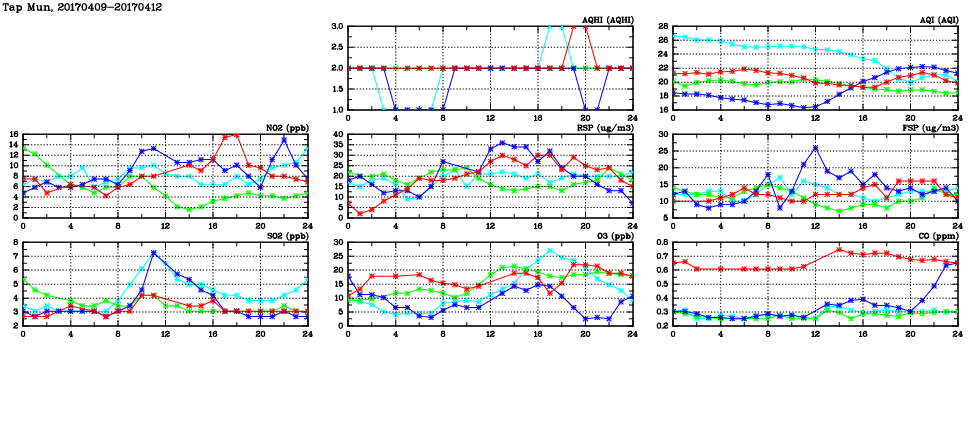 | Air Quality Data Time Series in Tap Mun (2017/04/12) | ( Line colors: Day -3 Day -2 Day -1 Current day ) | 2D Map Current AQHI |