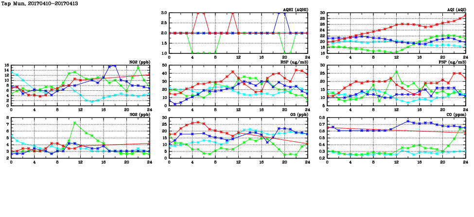| Air Quality Data Time Series in Tap Mun (2017/04/13) | ( Line colors: Day -3 Day -2 Day -1 Current day ) | 2D Map Current AQHI |