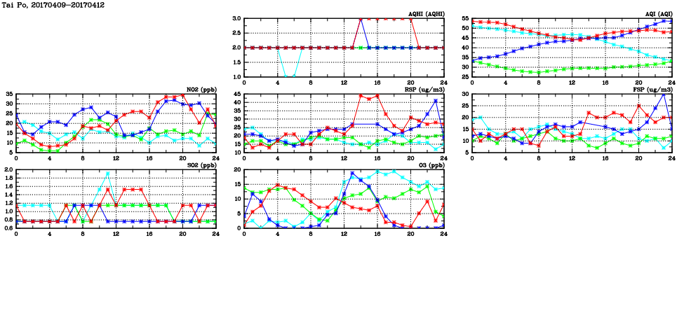 | Air Quality Data Time Series in Tai Po (2017/04/12) | ( Line colors: Day -3 Day -2 Day -1 Current day ) | 2D Map Current AQHI |