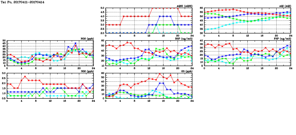 | Air Quality Data Time Series in Tai Po (2017/04/14) | ( Line colors: Day -3 Day -2 Day -1 Current day ) | 2D Map Current AQHI |