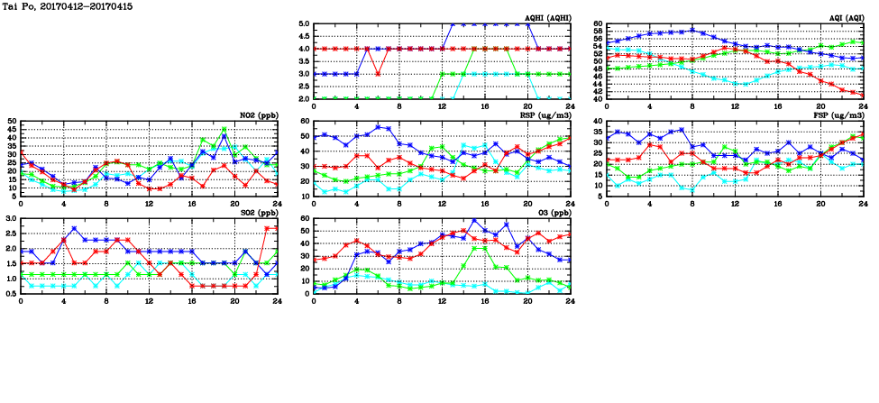 | Air Quality Data Time Series in Tai Po (2017/04/15) | ( Line colors: Day -3 Day -2 Day -1 Current day ) | 2D Map Current AQHI |