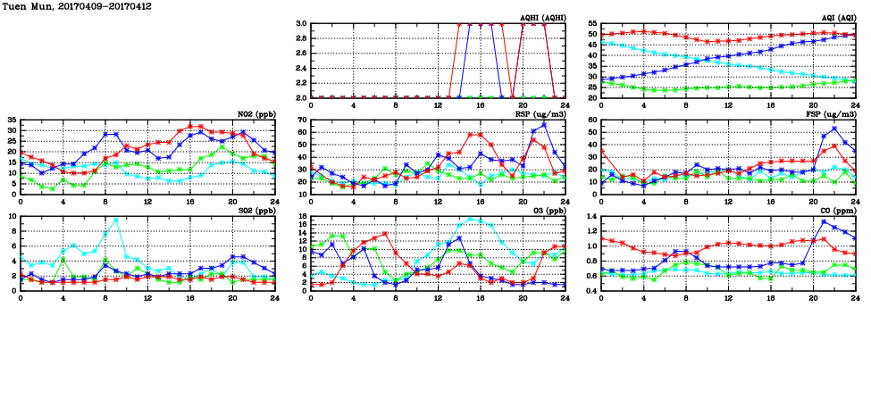 | Air Quality Data Time Series in Tuen Mun (2017/04/12) | ( Line colors: Day -3 Day -2 Day -1 Current day ) | 2D Map Current AQHI |