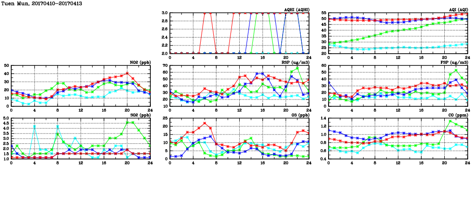| Air Quality Data Time Series in Tuen Mun (2017/04/13) | ( Line colors: Day -3 Day -2 Day -1 Current day ) | 2D Map Current AQHI |