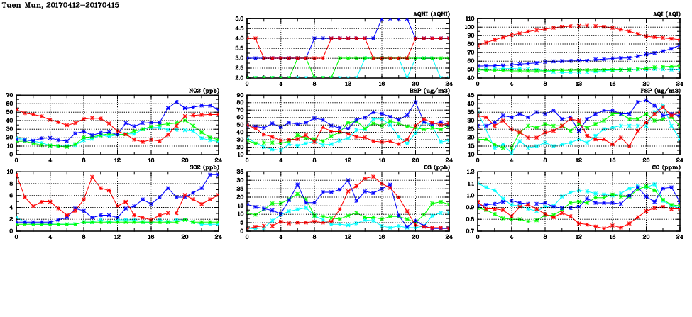 | Air Quality Data Time Series in Tuen Mun (2017/04/15) | ( Line colors: Day -3 Day -2 Day -1 Current day ) | 2D Map Current AQHI |