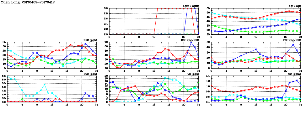 | Air Quality Data Time Series in Yuen Long (2017/04/12) | ( Line colors: Day -3 Day -2 Day -1 Current day ) | 2D Map Current AQHI |