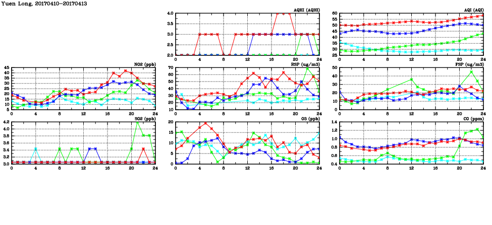| Air Quality Data Time Series in Yuen Long (2017/04/13) | ( Line colors: Day -3 Day -2 Day -1 Current day ) | 2D Map Current AQHI |