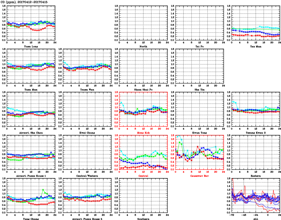 | Air Quality Data Time Series for CO (2017/04/15) | ( Line colors: Day -3 Day -2 Day -1 Current day ) | 2D Map Current AQHI |