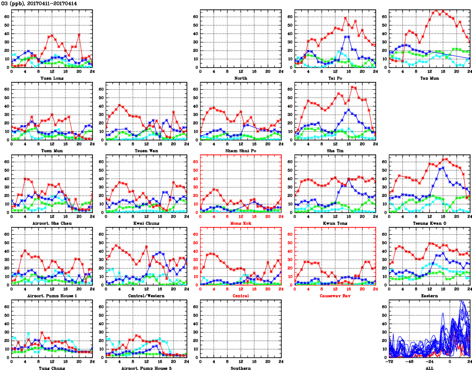| Air Quality Data Time Series for O3 (2017/04/14) | ( Line colors: Day -3 Day -2 Day -1 Current day ) | 2D Map Current AQHI |
