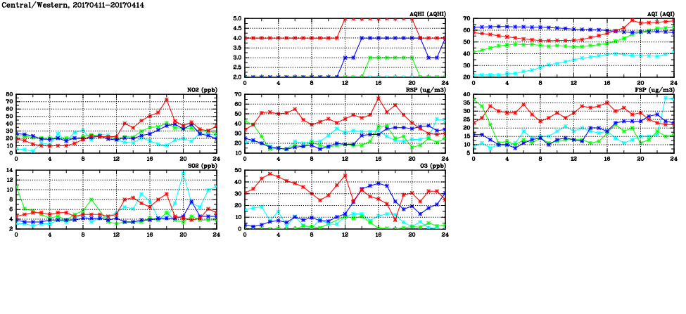 | Air Quality Data Time Series in Central/Western (2017/04/14) | ( Line colors: Day -3 Day -2 Day -1 Current day ) | 2D Map Current AQHI |