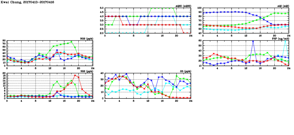 | Air Quality Data Time Series in Kwai Chung (2017/04/16) | ( Line colors: Day -3 Day -2 Day -1 Current day ) | 2D Map Current AQHI |