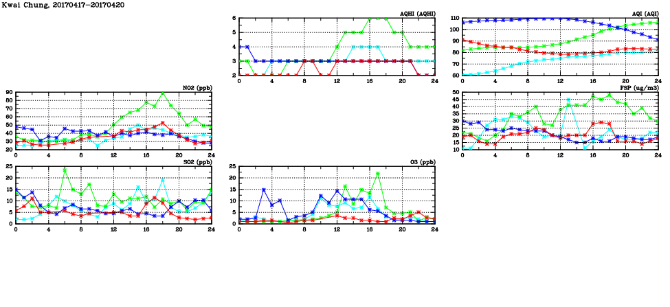 | Air Quality Data Time Series in Kwai Chung (2017/04/20) | ( Line colors: Day -3 Day -2 Day -1 Current day ) | 2D Map Current AQHI |