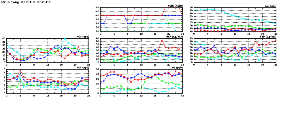 | Air Quality Data Time Series in Kwun Tong (2017/04/15) | ( Line colors: Day -3 Day -2 Day -1 Current day ) | 2D Map Current AQHI |