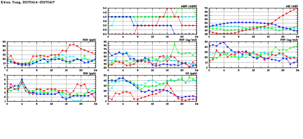 | Air Quality Data Time Series in Kwun Tong (2017/04/17) | ( Line colors: Day -3 Day -2 Day -1 Current day ) | 2D Map Current AQHI |