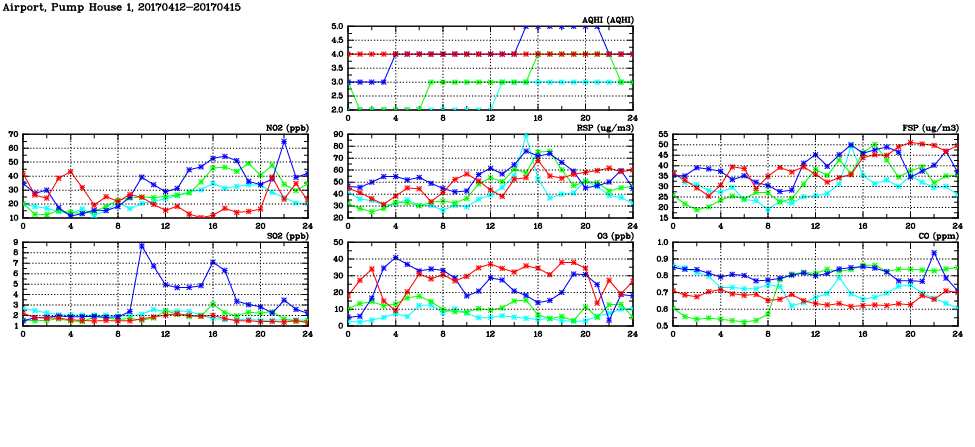 | Air Quality Data Time Series in Airport, Pump House 1 (2017/04/15) | ( Line colors: Day -3 Day -2 Day -1 Current day ) | 2D Map Current AQHI |