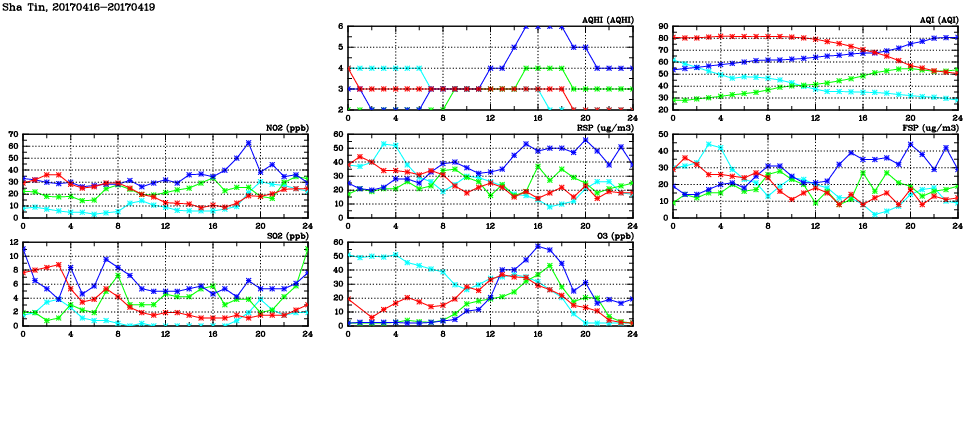 | Air Quality Data Time Series in Sha Tin (2017/04/19) | ( Line colors: Day -3 Day -2 Day -1 Current day ) | 2D Map Current AQHI |
