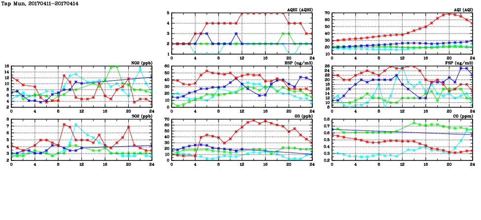 | Air Quality Data Time Series in Tap Mun (2017/04/14) | ( Line colors: Day -3 Day -2 Day -1 Current day ) | 2D Map Current AQHI |