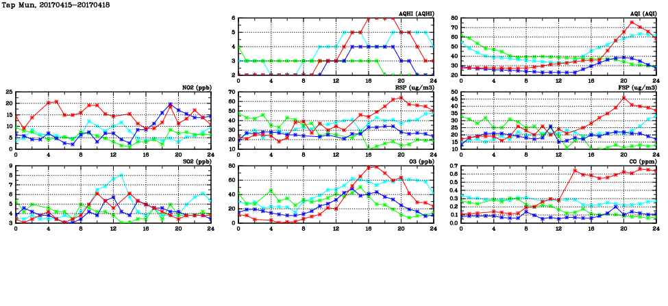 | Air Quality Data Time Series in Tap Mun (2017/04/18) | ( Line colors: Day -3 Day -2 Day -1 Current day ) | 2D Map Current AQHI |