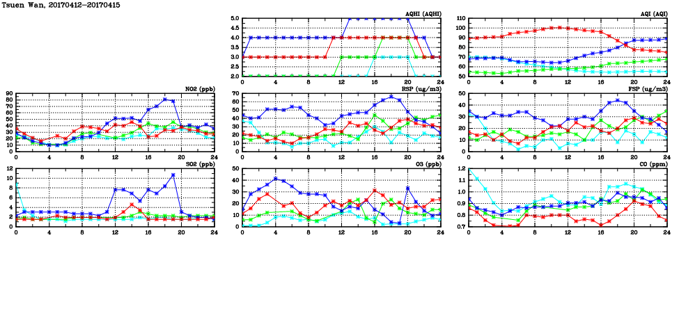 | Air Quality Data Time Series in Tsuen Wan (2017/04/15) | ( Line colors: Day -3 Day -2 Day -1 Current day ) | 2D Map Current AQHI |